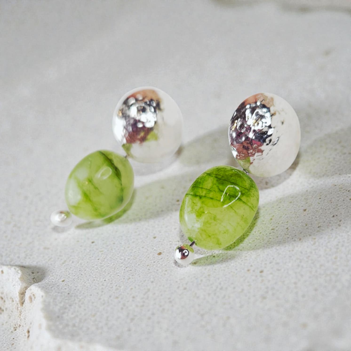 Les boucles d’oreilles Verde Flora associent la texture vivante de l’argent 925 martelé à la douceur minérale d’une fluorine verte, pierre reconnue pour ses nuances apaisantes et lumineuses.